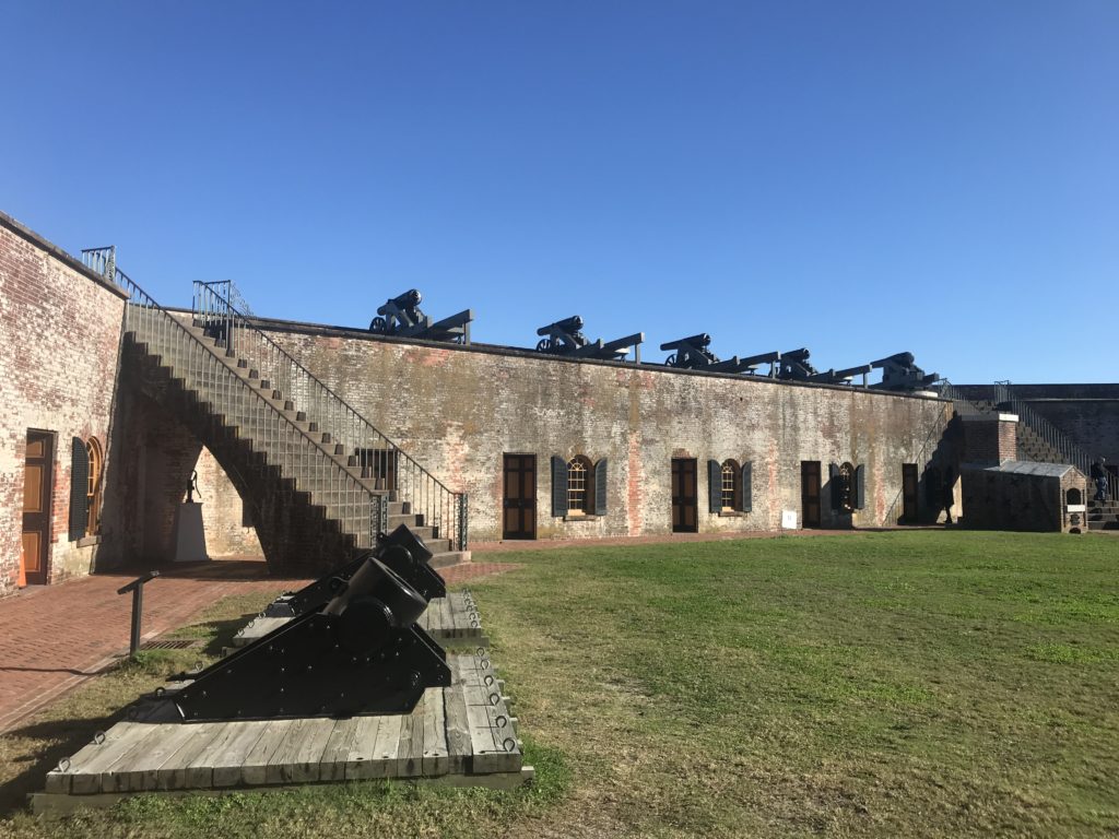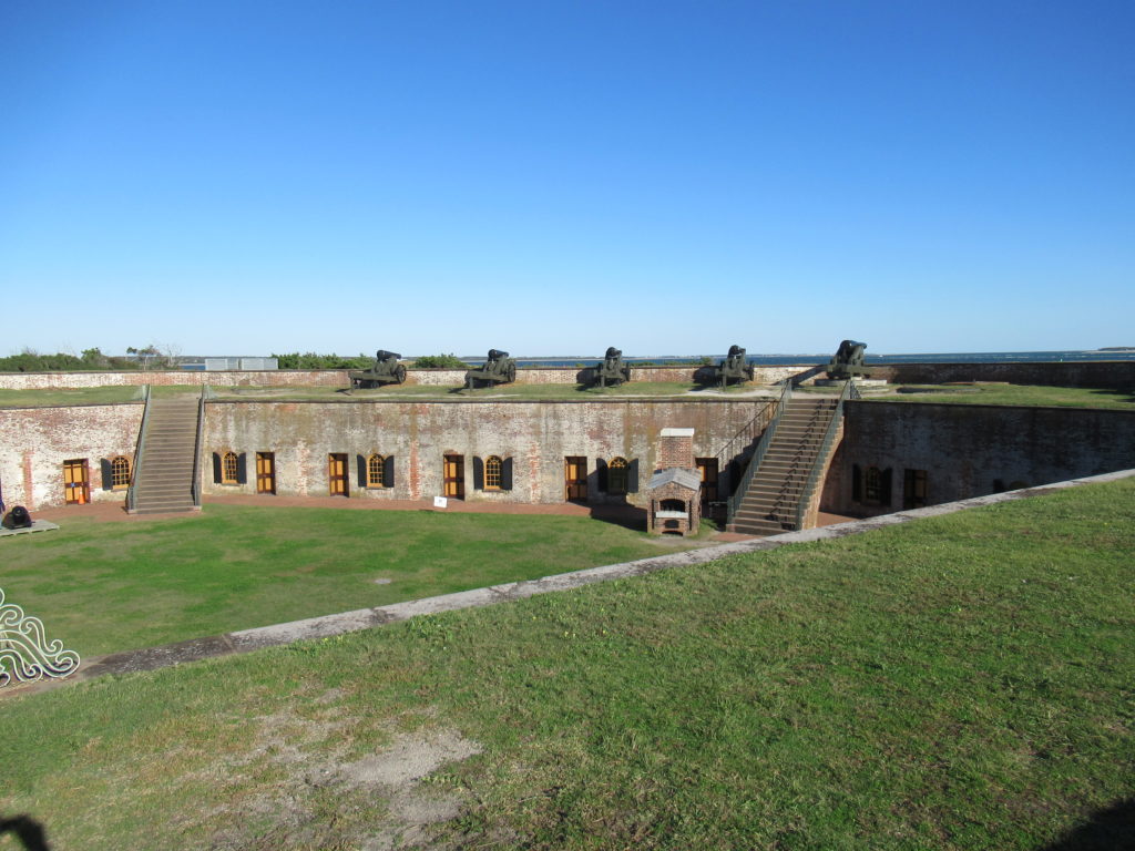 Emerald Isle. This is part of the Outer Banks and is a 12 mile long by half mile wide island. It is filled with beach houses, parks, and wildlife refuges from one end to the other and is quite picturesque. We “wiked” on both the island and the mainland, as well as touring Fort Morgan at the north end of the Isle. This was a key fortification during the Civil War and well preserved.